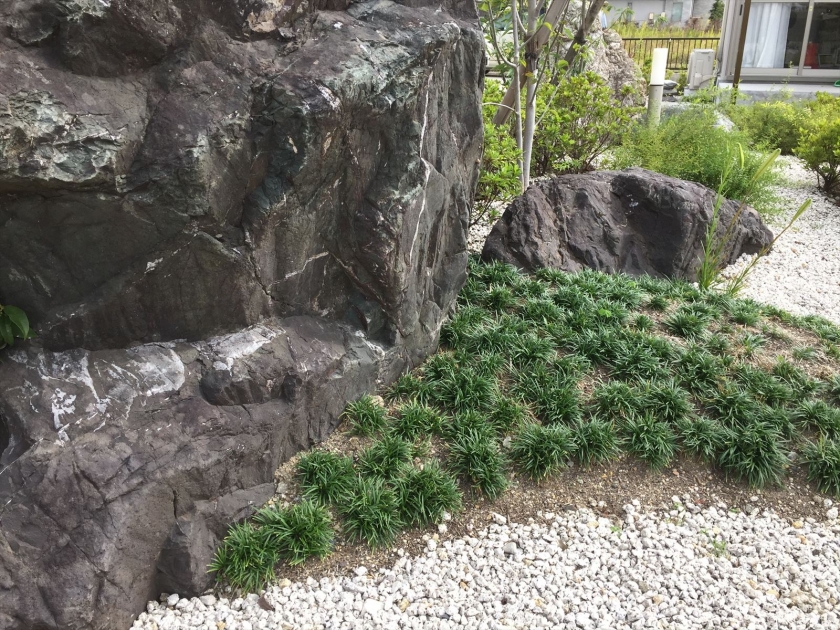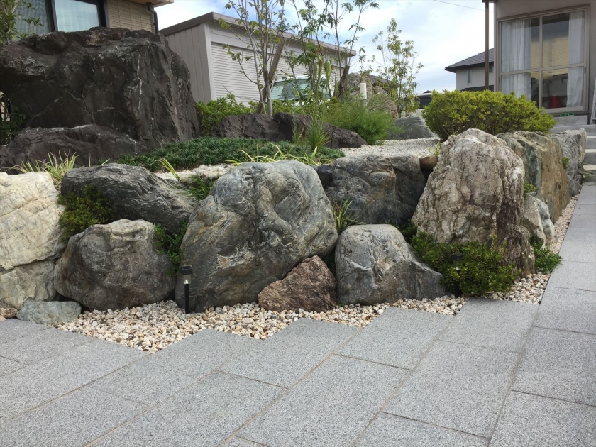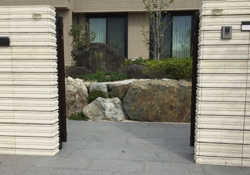門を入ると石積みが・・・前の家に使っていた石があるので使ってほしい との事。良い石、大きい石等量もいっぱいでした。石置き場からクレーン付きトラックで運んで一つづつ積みました。目地はモルタルを使用せず、植栽してあります。