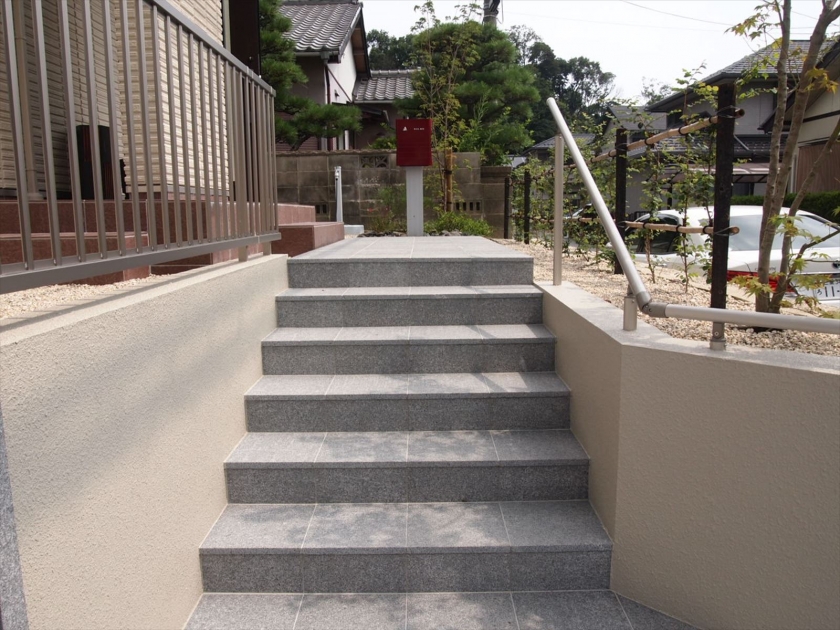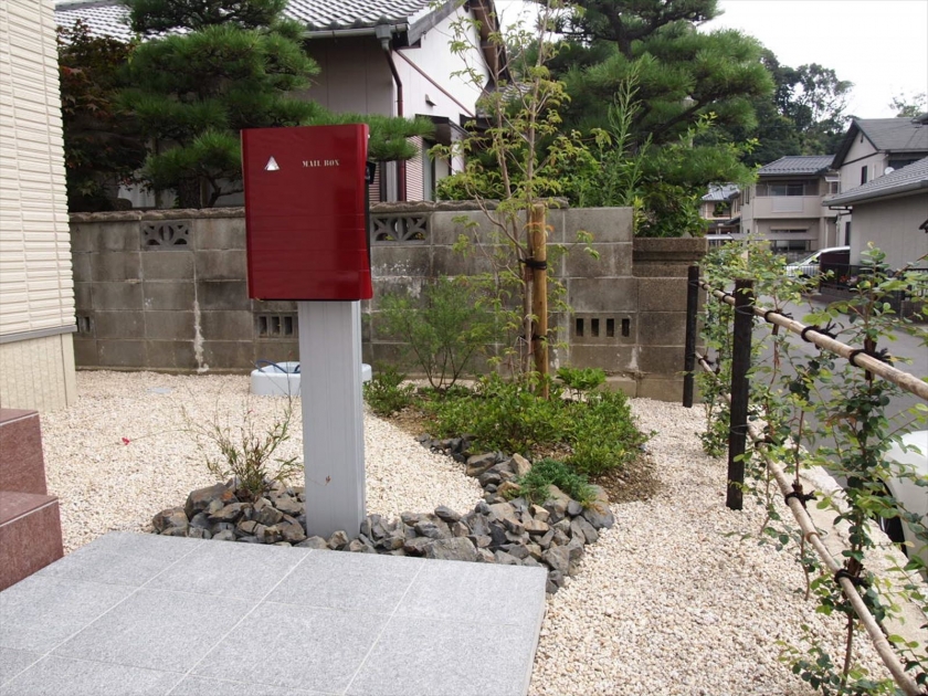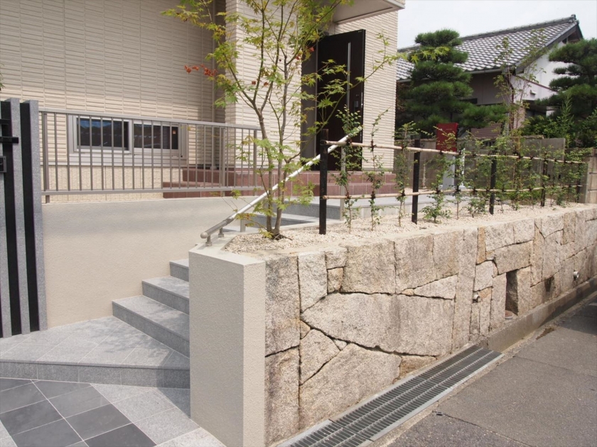 建て替え前の古い石積みがありましたので 野面積みですと和風色が強くなりますがこの石積みなら新しい家にも合う! うまく使うことによって予算削減とセンスアップです。 門柱も石を使って意匠を凝らしました。